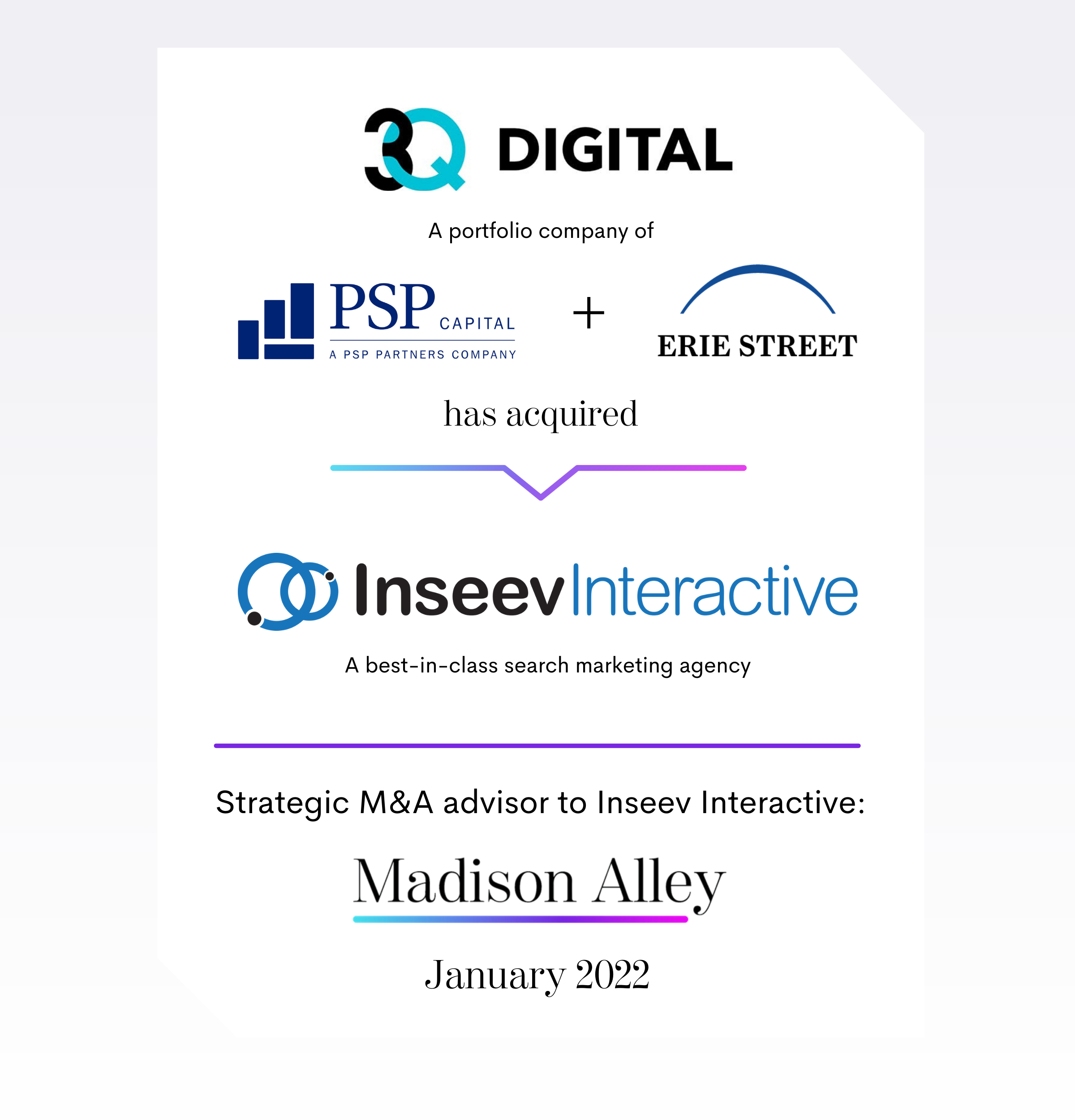 Andreas Roell, Managing Director of Madison Alley, added, "It is a wonderful experience to see the highly talented Inseev team become part of 3Q Digital. We are proud to have successfully been able to communicate Inseev's highly effective and innovative SEO methodologies and services. We congratulate 3Q, along with PSP Partners, on this transaction and its visionary approach to expanding its digital marketing offerings."
