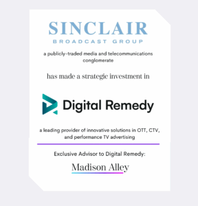 Madison Alley Global Ventures, the preeminent M&A capital advisory firm for the digital marketing, advertising, and commerce sectors, today announced that it served as the exclusive advisor for Digital Remedy, a leading digital advertising solutions provider for high-performance campaigns across CTV/OTT and other digital media. Madison Alley helped Digital Remedy secure a strategic investment from Sinclair Broadcast Group.